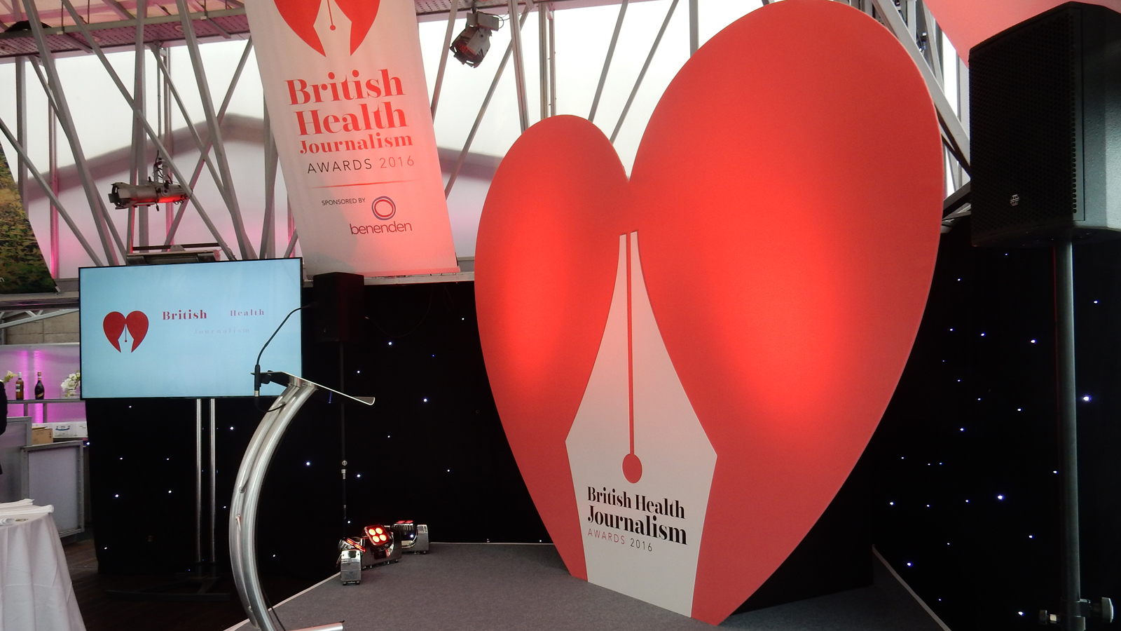 White Production Design were pleased to be working at the 2016 British Health Journalism Awards held at The Deck in The National Theatre, London. Services supplied included a bespoke CNC-cut heart-shaped backdrop which was created in White PD’s workshop in Peterborough and covered in printed fabric to reflect the awards’ logo. The unusual set-piece was mounted on a Prolyte Litedeck curved stage and set off by black star-cloth draping.